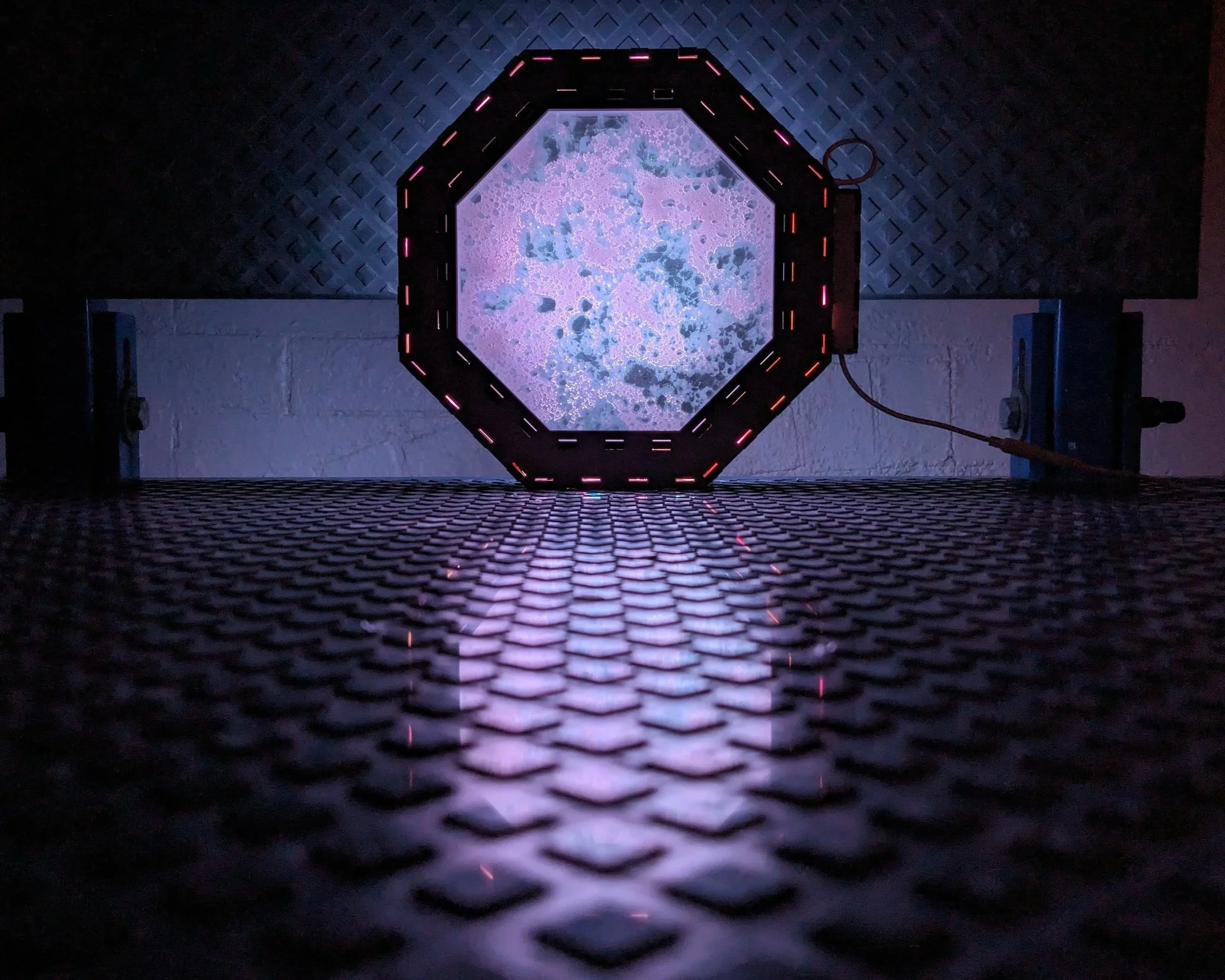 Chroma Scrub is the first piece in a series that I am going to be working on. I was experimenting with a new way to output and outsource my designs through laser cutting/engraving. With this I took one of my bubble textures, put it into grayscale, indexed it down to 22 grays, and split them into five layers by the lights to the darks with some overlap. I cut an 8”x8” octagon out of those layers and had them engraved onto acrylic panels that I sandwiched together inside of a laser cut plywood frame. The frame was designed and constructed to house the acrylic panels and filter the lights of the LED tape through the engraved layers. Using RGBIC LEDs I’m able to change the colors and set up animated light sequences controlling each of the 15 light groupings, creating an interactive and comforting lighting design.